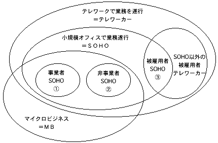 テレワーカーのなかには、小規模オフィスや在宅で勤務していない者もいるので、それらは図では「SOHO以外の被雇用者テレワーカー」と表示している。携帯端末を持って勤務をしているような、いわゆる「モバイルワーカー」等をイメージしている。またマイクロビジネスは、被雇用者ではない、という観点から破線の円で表示した。
